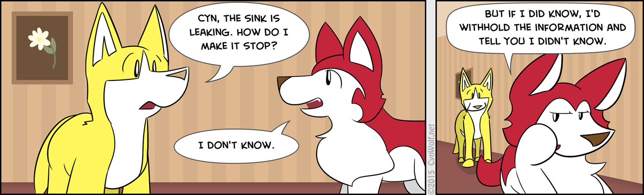 If I Do Know I Don’t August 15, 2015 ↞ ← ARCHIVE → ↠ Bingo: Cyn, the sink is leaking. How do I make it stop? Cyn: I don’t know. But if I did know, I’d withhold the information and tell you I didn’t know. ↞ ← ARCHIVE → ↠