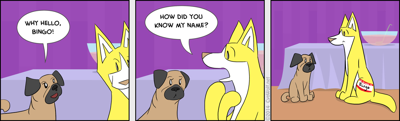 My Name Is January 18, 2015 ↞ ← ARCHIVE → ↠ Pug: Why hello, Bingo! Bingo: How did you know my name? ↞ ← ARCHIVE → ↠